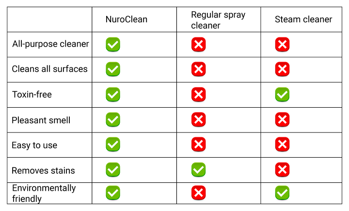 Unlike regular cleaning supplies, NuroClean is a universal solution. This one cleaning spray will tackle all stains on any surface. And there are even more benefits to using NuroClean: